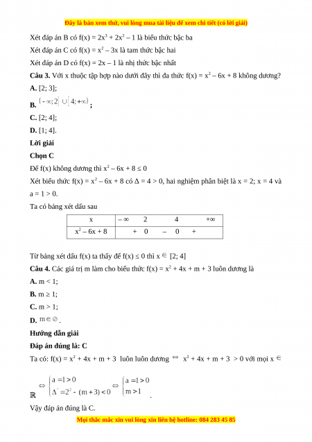 Câu 3. Với x thuộc tập hợp nào dưới đây thì đa thức f(x) = x2 – 6x + 8 không dương? A. [2; 3]; B. ; C. [2; 4]; D. [1; 4]. Lời giải Chọn C