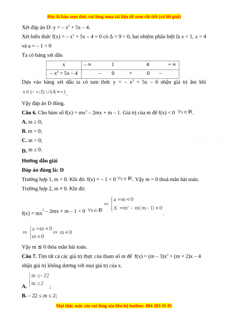 Câu 6. Cho hàm số f(x) = mx2 – 2mx + m – 1. Giá trị của m để f(x) < 0 . A. m ≥ 0; B. m > 0; C. m < 0; D. m ≤ 0.