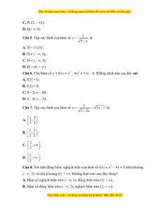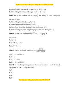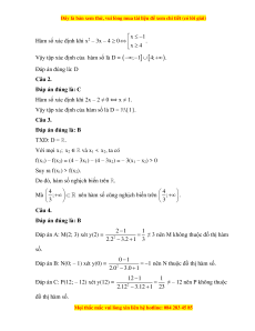 D. m ≥ 2 hoặc m < 1. x − 2 Câu 14. Hàm số y = có tập xác định là: 2 x − 3 − 2 A. ( ; − − 3) ( 3;+); B. ( ; − − 3 3;+ )\ 7; C. ( ;
