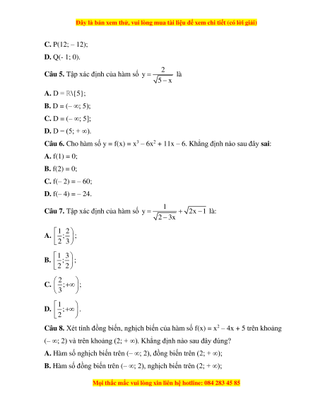 Câu 5. Tập xác định của hàm số y = là 5 − x A. D = ℝ\{5}; B. D = (– ∞; 5); C. D = (– ∞; 5]; D. D = (5; + ∞).