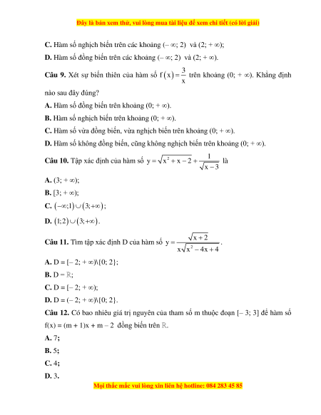 Câu 10. Tập xác định của hàm số 2 y = x + x − 2 + là x − 3 A. (3; + ∞); B. [3; + ∞); C. ( ; − ) 1 (3;+) ;