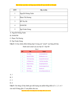 STT Họ và tên 1 Nguyễn Hoàng Xuân 2 Phạm Thị Hương 3 Đỗ Thu Hà 4 03456789 5 Ngô Xuân Giang A. Nguyễn Hoàng Xuân B. 03456789 C. Phạm Thị Hương D. Ngô Xuân Giang