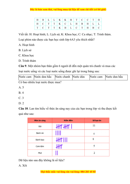 Câu 10. Lan tìm hiểu về thức ăn sáng nay của các bạn trong lớp và thu được kết
