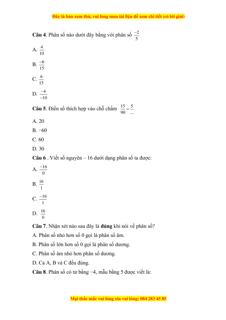 Câu 4. Phân số nào dưới đây bằng với phân số 2 5 4 A. 10 6 − B. 15 6 C. 15 −4 D. −10 15 5