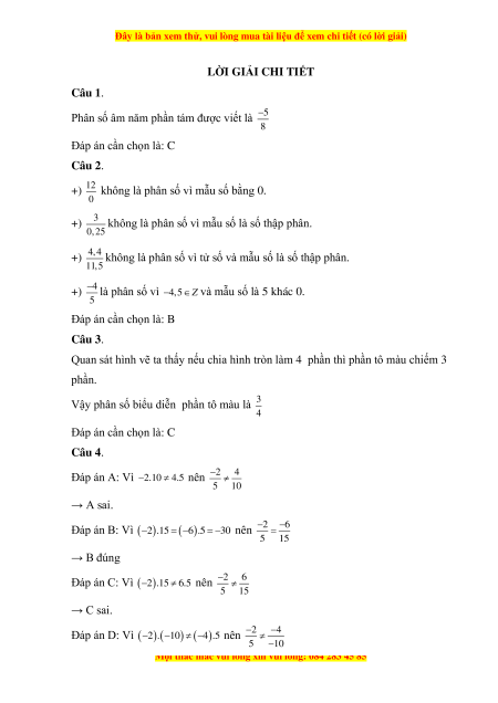 Quan sát hình vẽ ta thấy nếu chia hình tròn làm 4 phần thì phần tô màu chiếm 3 phần. Vậy phân số biểu diễn 3 phần tô màu là 4 Đáp án cần chọn là: C Câu 4. Đáp án A: Vì 2 − 4 2.10 − 4.5 nên 5 10 → A sai. Đáp án B: Vì ( 2 − 6 − 2 − ).15 = ( 6 − ).5 = 3 − 0 nên = 5 15 → B đúng Đáp án C: Vì ( 2 − 6 2 − ).15 6.5 nên 5 15 → C sai. Đáp án D: Vì ( 2 − 4 − 2 − ).( 1 − 0) ( 4 − ).5 nên 5 1 − 0