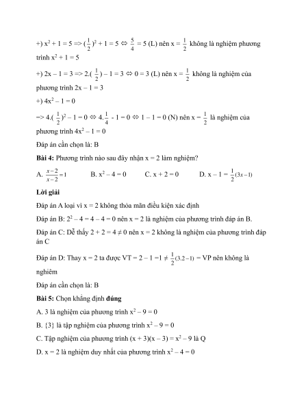 Bài 4: Phương trình nào sau đây nhận x = 2 làm nghiệm? A. x − 2 =1 B. x2 – 4 = 0 C. x + 2 = 0