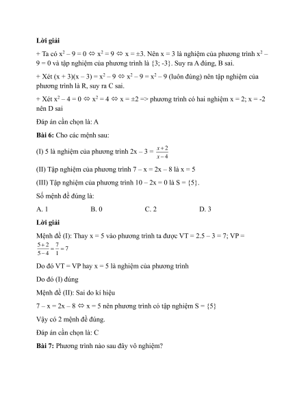 9 = 0 và tập nghiệm của phương trình là {3; -3}. Suy ra A đúng, B sai.