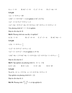 Bài 7: Phương trình nào sau đây vô nghiệm? A. x – 1 = 0 B. 4x2 + 1 = 0 C. x2 – 3 = 6 D. x2 + 6x = -9 Lời giải +) x – 1 = 0 x = 1Ø