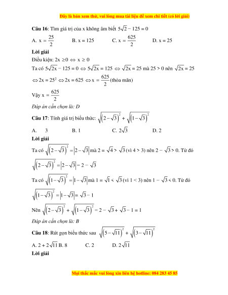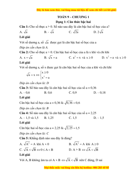 Câu 4: Số nào sau đây là căn bậc hai số học của số a = 2,25 A. – 1,5 và 1,5 B. 1,25 C. 1,5 D. – 1,5 Lời giải
