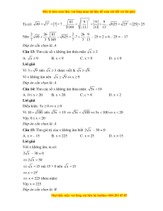 Câu 11: Giá trị của biểu thức 25 − + 169 là: 5 2 81 A. 12 B. 13 C. 14 D. 15 Lời giải Ta có 2 25 = 5 = 5 = 5 2 16 4 4 4 = = = , 2 169 = 13 = 13 = 13 81 9 9 9 2 9 16 2 9 4 Nên 25 −
