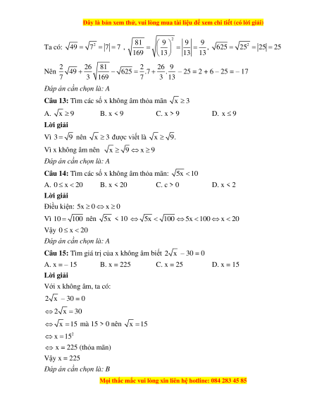 Câu 13: Tìm các số x không âm thỏa mãn x 3 A. x 9 B. x < 9 C. x > 9 D. x 9 Lời giải