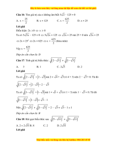 Câu 12: Giá trị của biểu thức 49 + − 625 là: 7 3 169 A. – 17 B. 15 C. 18 D. 17 Lời giải