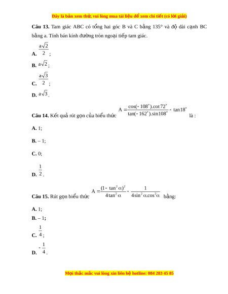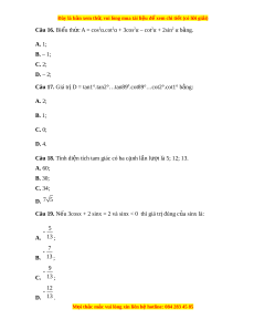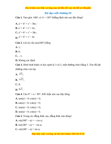 ằ a. Tính bán kính đư ng t ờ ròn ngo i ạ ti p t ế am giác. a 2 A. 2 ; B. a 2 ; a 3 C. 2 ; D. a 3 . cos( 108 ).cot 72 A tan18 Câu 14. K t ế qu r ả út g n c ọ a ủ bi u t ể h c ứ tan( 162 ).sin108 là : A. 1; B. – 1; C. 0; 1 D. 2 . 2 2 (1 tan ) 1 A Câu 15. Rút g n bi ọ u ể th c ứ 2 2 2 4tan 4sin . cos b ng: ằ A. 1; B. – 1; 1 C. 4 ; 1 D. 4 . M i