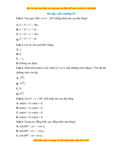 A. a2 = b2 + c2 – 3bc; B. a2 = b2 + c2 + bc; C. a2 = b2 + c2 + 3bc; D. a2 = b2 + c2 – bc. Câu 2. Giá tr c ị a ủ tan(180°) b ng ằ A. 1; B. 0; C. – 1; D. Không xác định.