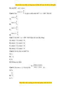 D. sin(α) < 0; cos(α) < 0. Câu 8. Giá tr c ị a ủ cot1485° là: A. 1; B. – 1; C. 0; D. Không xác định. 3sin cos A
