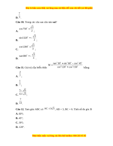 tan 30 sin 60 cos 45 M Câu 11. Giá tr c ị a ủ bi u t ể h c ứ 2 2 cot 120 cos 150 b ng: ằ 2 A. 7 ; 1 B. 7 ; 5 6 C. 6 3 ; 7 D. 13 .