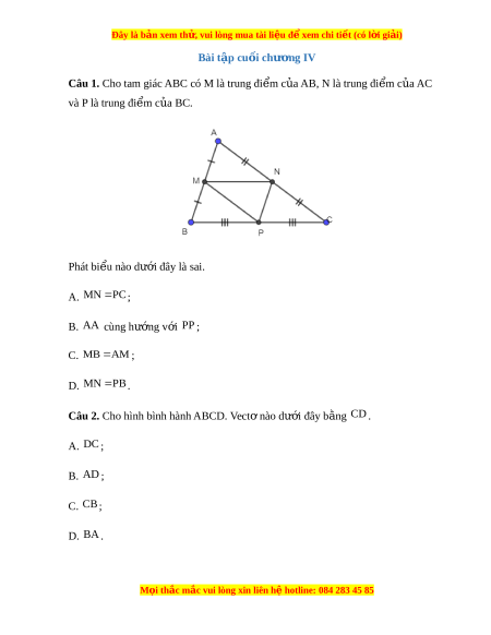 Câu 1. Cho tam giác ABC có M là trung đi m ể c a ủ AB, N là trung đi m ể c a ủ AC và P là trung đi m ể c a ủ BC. Phát bi u nào d ể ư i ớ đây là sai. A. MN P C ;