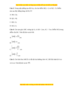 Câu 8. Khi nào tích vô hư ng c ớ a ủ hai vecto u,v là m t ộ số dư ng. ơ r r A. Khi góc gi a hai ữ vectơ u,v là m t ộ góc tù; r r B. Khi góc gi a ữ hai vect ơ u,v là góc bẹt; r r C. Khi và ch khi ỉ góc gi a ữ hai vect ơ u,v b ng 0 ằ 0; r r D. Khi góc gi a hai ữ vectơ u,v là góc nh n ho ọ c b ặ ng ằ 00. Câu 9. S chuy ự n đ ể ng c ộ a ủ m t ộ tàu th y đ ủ ư c ợ th hi ể n t ệ rên m t ộ m t ặ ph ng t ẳ a ọ đ nh ộ s ư au: Tàu kh i ở hành t v ừ t ị rí A(-3; 2) chuy n đ ể ng t ộ h ng ẳ đ u v ề i ớ v n t ậ c ố rv=(2; ) (tính theo gi ) ờ đư c ợ bi u t ể h b ị i ở vecto 5 . Xác đ nh v ị t ị rí c a t ủ àu (trên m t ặ ph ng t ẳ a ọ đ ) ộ t i ạ th i ờ đi m ể sau khi kh i ở hành 2 gi . ờ A. (-1; 7); B. (4; 10); C. (1; 12); D. Không xác định đư c ợ v t ị rí c a t ủ àu. Câu 10. Trong m t ặ ph ng t ẳ a ọ đ O ộ xy cho các đi m