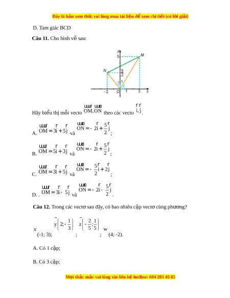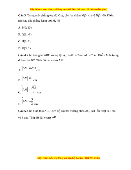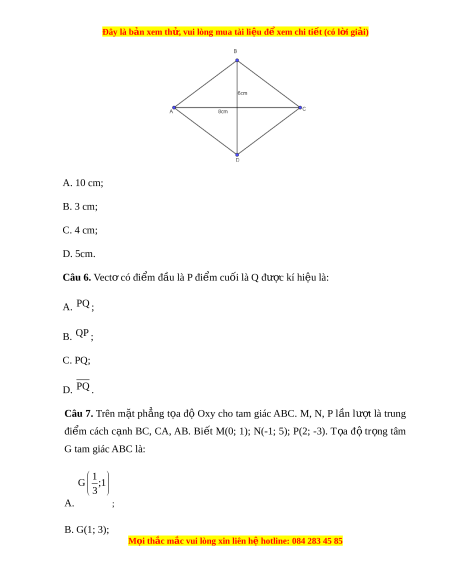 Đây là bản xem th , vu ử i lòng mua tài li u ệ đ xe ể m chi ti t (c ế ó l i ờ gi i ả ) A. 10 cm; B. 3 cm; C. 4 cm; D. 5cm. Câu 6. Vect có ơ đi m ể đầu là P đi m ể cu i ố là Q đư c ợ kí hi u l ệ à: