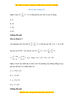 Đây là bản xem th , vu ử i lòng mua tài li u ệ đ xe ể m chi ti t ế (có l i ờ gi i ả ) Bài ôn tập chư ng ơ VII 2 x Câu 1. Elip E 2 : y 4 có tổng đ dài ộ tr c l ụ n và ớ tr c bé ụ b ng: ằ 16 A. 5; B. 10; C. 20; D. 40. Hư ng ớ d n gi ẫ i ả Đáp án đúng là: C 2 2 x y G i ọ phư ng ơ trình c a ủ Elip là 1 , có độ dài tr c ụ l n ớ A A 2a và độ 2 2 a b 1 2 2 x 2 2 x y dài tr c ụ bé là B B 2 1