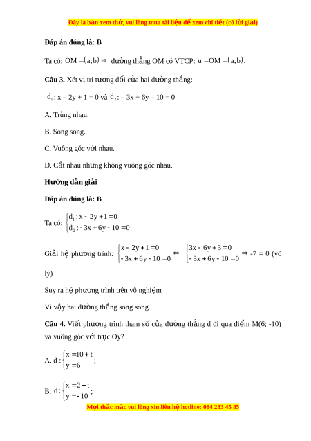 Đây là bản xem th , vu ử i lòng mua tài li u ệ đ xe ể m chi ti t ế (có l i ờ gi i ả ) x 6 C. d : ; y 10 t x 6 D. d : . y 10 t Hư ng ớ d n gi ẫ i ả Đáp ng đúng l ứ à: B Ta có: d Oy : x 0 u 1;0 M 6; 10 d d , m t ặ khác x 6 t x 2 Phư ng t ơ rình tham số d : , v i ớ t = -4 ta đư c ợ d : y 10 y 10 x 2 t
