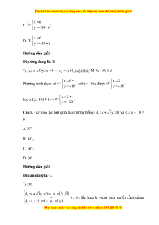 hay A (2; -10) d d : . y 10 Câu 5. Góc nào t o ạ b i ở gi a ữ hai đư ng ờ th ng: ẳ d : x 3y 0 d : x + 10 = 1 và 2 0 . A. o 30 ; B. o 45 ; C. o 60 ; D. o 90 . Hư ng ớ d n gi ẫ i ả Đáp án đúng là: C Ta có: d : x 3y 0 n 1; 3 1 1 n n 1 ; 2 lần lư t ợ là vectơ pháp tuy n ế c a ủ đư ng ờ d : x 10 0 n 1;0 2 2 M i ọ thắc m c