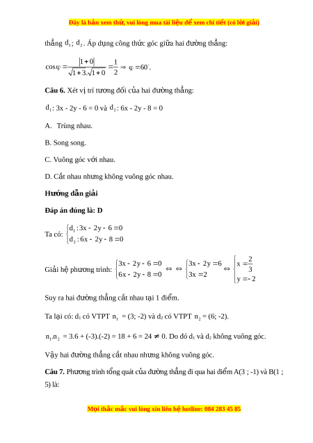 Đây là bản xem th , vu ử i lòng mua tài li u ệ đ xe ể m chi ti t ế (có l i ờ gi i ả ) th ng ẳ d d 1 ; 2 . Áp d ng công t ụ h c góc ứ gi a hai ữ đư ng t ờ h ng: ẳ 1 0 1 cos 6 0 . 1 3. 1 0 2