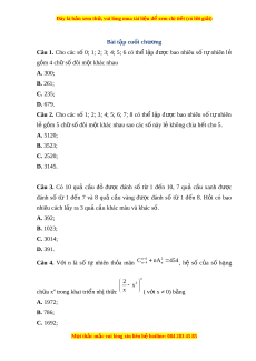 Câu 1. Cho các số 0; 1; 2; 3; 4; 5; 6 có th ể l p ậ đư c ợ bao nhiêu s ố t ự nhiên lẻ gồm 4 chữ số đôi m t ộ khác nhau A. 300; B. 261; C. 235; D. 679.