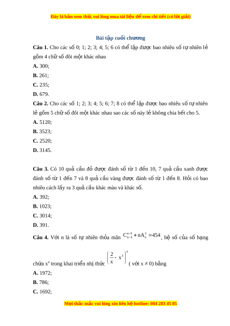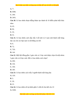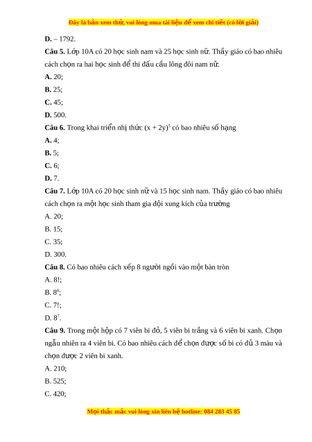 Đây là bản xem th , vu ử i lòng mua tài li u ệ đ xe ể m chi ti t ế (có l i ờ gi i ả ) D. – 1792. Câu 5. L p 10A ớ có 20 h c ọ sinh nam và 25 h c ọ sinh n . ữ Th y gi ầ áo có bao nhiêu cách ch n ọ ra hai h c s ọ inh để thi đ u c ấ u l ầ ông đôi nam n . ữ A. 20; B. 25; C. 45; D. 500.
