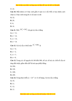 Đây là bản xem th , vu ử i lòng mua tài li u ệ đ xe ể m chi ti t ế (có l i ờ gi i ả ) D. 24. Câu 10. M t ộ nhóm có 6 h c ọ sinh g m ồ 4 nam và 2 n . ữ H i ỏ có bao nhiêu cách ch n r ọ a 3 h c s ọ inh trong đó có c nam ả và n . ữ A. 32; B. 20; C. 6; D. 16. 4 4 Câu 11. N u ế 2A 3 A n n 1 thì giá tr c ị a n b ủ ng ằ A. n = 11; B. n = 12; C. n = 13; D. n = 14. 3 Câu 12. Giá tr c ị a ủ n tho m ả ãn A 2 0n n là A. n = 6; B. n = 5; C. n = 7; D. n = 8.