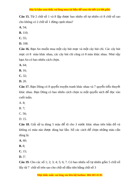 ợ bao nhiêu số tự nhiên có 8 chữ số sao cho không có 2 ch s ữ ố 1 đ ng c ứ nh nhau? ạ A. 54; B. 110; C. 55; D. 108. Câu 16. B n ạ An mu n ố mua m t ộ cây bút m c ự và m t