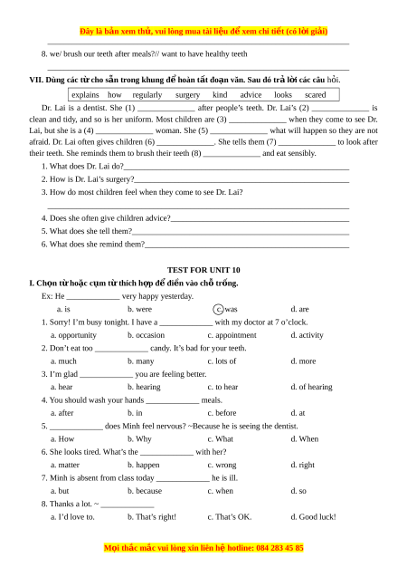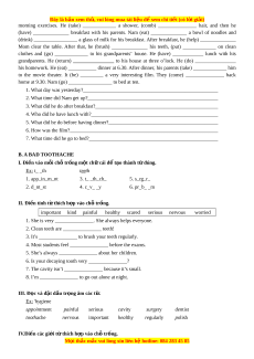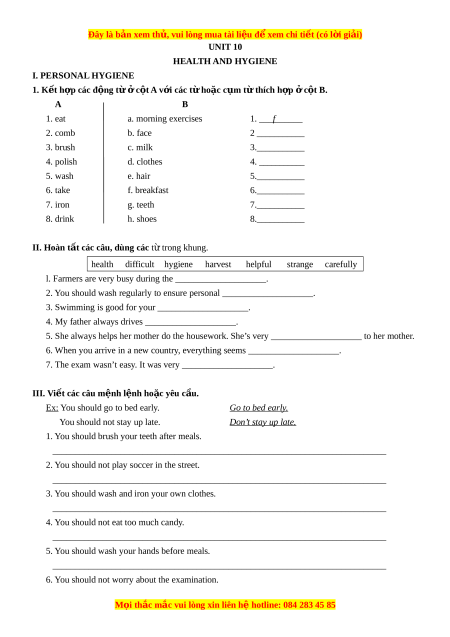 ệ đ xe ể m chi ti t ế (có l i ờ gi i ả ) UNIT 10 HEALTH AND HYGIENE I. PERSONAL HYGIENE 1. K t h ế p ợ các đ n ộ g t ừ c ở t ộ A v i ớ các t h ừ o c ặ c m t ụ th ừ ích h p ợ c ở t B. ộ A B 1. eat a. morning exercises 1. ___f______ 2. comb b. face 2 ___________ 3. brush c. milk 3.___________ 4. polish d. clothes 4. ___________ 5. wash e. hair 5.___________ 6. take f. breakfast 6.___________ 7. iron g. teeth 7.___________ 8. drink h. shoes 8.___________ II. Hoàn t t c
