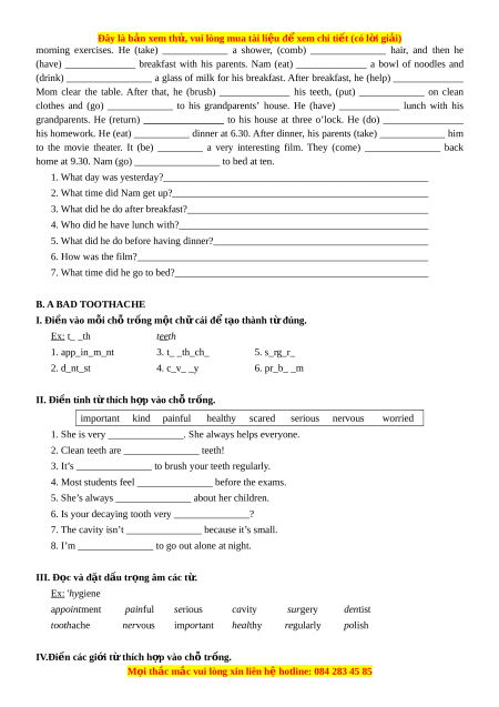 7. What time did he go to bed?___________________________________________________ B. A BAD TOOTHACHE I. Đi n ề vào m i ỗ ch tr ỗ n ố g m t c ộ h c ữ ái đ t ể o t ạ hành t đ ừ úng. Ex: t_ _th teeth 1. app_in_m_nt 3. t_ _th_ch_ 5. s_rg_r_ 2. d_nt_st 4. c_v_ _y 6. pr_b_ _m II. Đi n ề tính t th ừ ích h p ợ vào ch tr ỗ n ố g. important kind painful healthy scared serious nervous worried