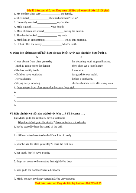 8. Dr Lai filled the cavity ______________ Minh’s tooth. V. Dùng liên t b ừ ecause đ k ể t h ế p ợ các câu c ở t ộ A v i
