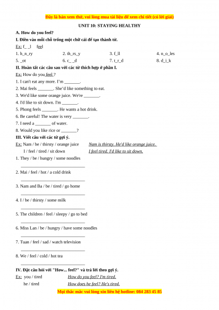 Bài tập Unit 10: STAYING HEALTHY - Giáo viên Mai Lan Hương đầy đủ đáp án