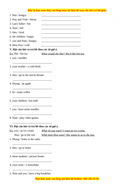 1. Mai / hungry _____________________________ 2. Huy and Vinh / thirsty _____________________________ 3. Lan's father / hot _____________________________ 4. Nam / full _____________________________ 5. they / tired _____________________________ 6. the children / happy _____________________________ 7. you and Nam / hungry _____________________________ 8. Miss Hoa / cold _____________________________