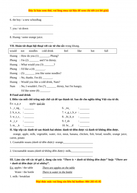 VII. Hoàn tất đoạn hội thoại với các từ cho sẵn trong khung. would not noodles cold drink feel like hot full