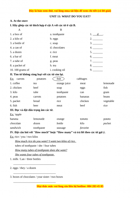I. Hãy ghép các từ thích hợp ở cột A với các từ ở cột B. A B 1. a box of a. toothpaste 1. d . 2. a kilo of b. eggs 2. _______ 3. a bottle of c. soap 3. _______ 4. a can of d. chocolates 4. _______ 5. a dozen e. rice 5. _______ 6. a bar of f. meat 6. _______ 7. a tube of g. peas 7. _______ 8. a packet of h. tea 8. _______ 10. 100 grams of i. cooking oil 9. _______