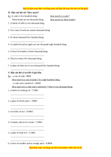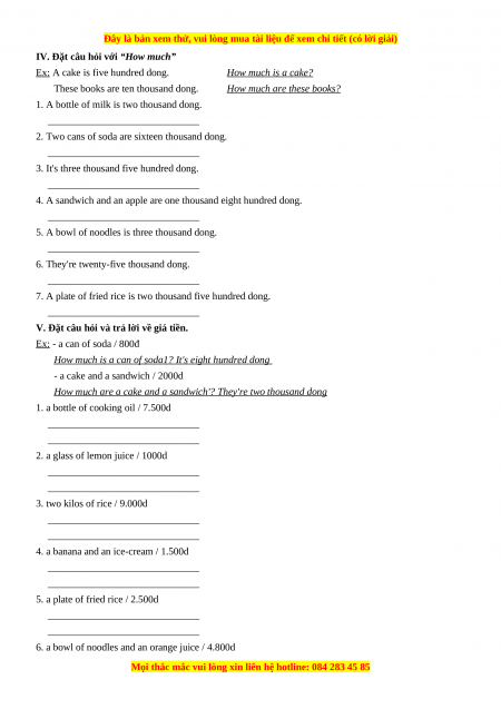 IV. Đặt câu hỏi với "How much” hoặc “How many” và trả lời theo các từ gợi ý.