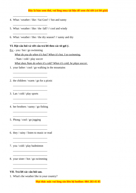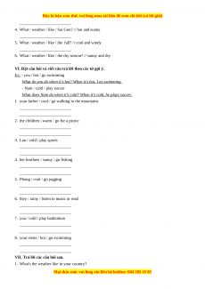 V. Đặt câu hỏi và viết câu trả lời về thời tiết theo các từ gợi ý.