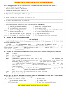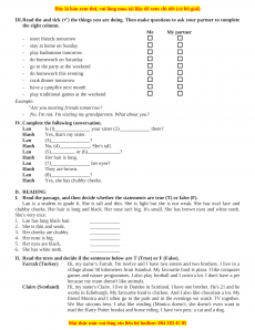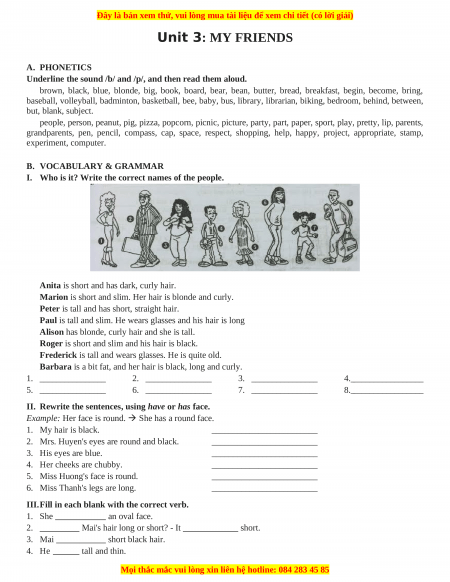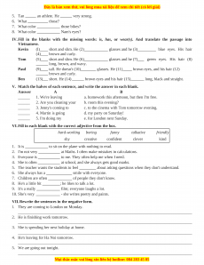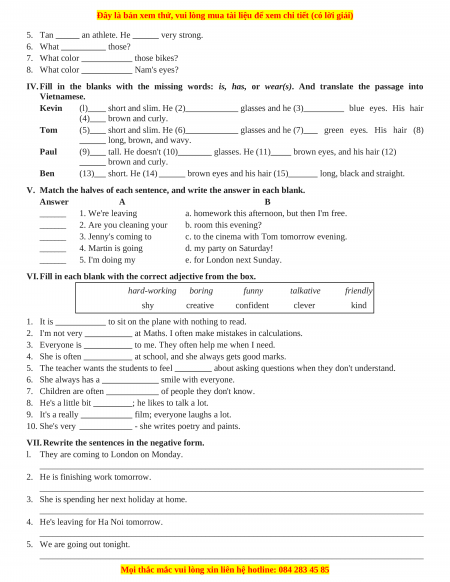 IV. Fill in the blanks with the missing words: is, has, or wear(s). And translate the passage into Vietnamese. Kevin (l) short and slim. He (2) glasses and he (3) blue eyes. His hair (4) brown and curly. Tom (5) short and slim. He (6)