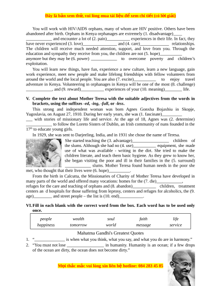 V. Complete the text about Mother Teresa with the suitable adjectives from the words in