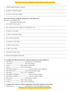 than my Math course. (difficult) 6. The Nile River is than the Mississippi. (long) 7. The dog is than a cow. (intelligent) 8. My mother's cooking is than my father's. (good) 9. My father's cooking is than my mother's. (bad) 10. This dress is than that one. (pretty) 11. A horse is than a man. (strong) 12. A rose is than a weed. (beautiful)