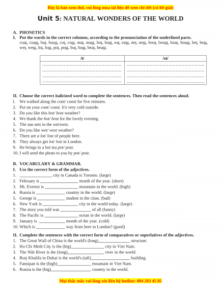 Bài tập Unit 5: NATURAL WONDERS OF THE WORLD - Giáo viên Lưu Hoằng Trí đầy đủ đáp án