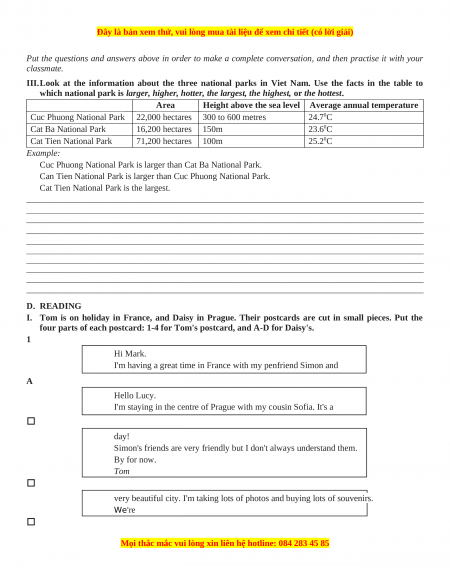 III.Look at the information about the three national parks in Viet Nam. Use the facts in the table to