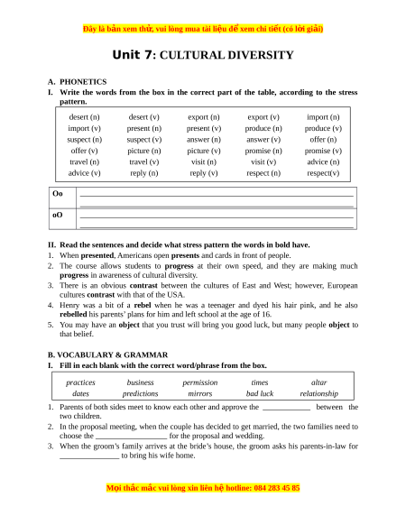 Unit 7: CULTURAL DIVERSITY A. PHONETICS