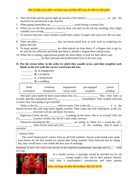 of the wedding, they’ll need a vacation! Cultural Note: III.Fill T in he e wach ord b “ lank hone wi ym th th oon” ec cor om r e e s ct ar from ti acnl e: ol a d , an Iris or h t t rahe