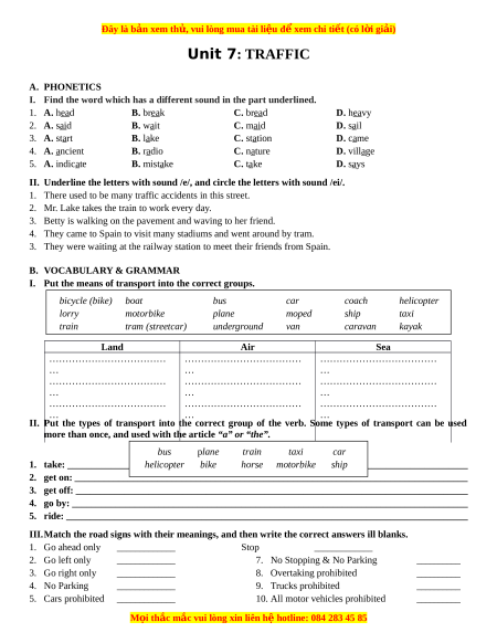 ệ đ xe ể m chi ti t ế (có l i ờ gi i ả ) Unit 7: TRAFFIC A. PHONETICS