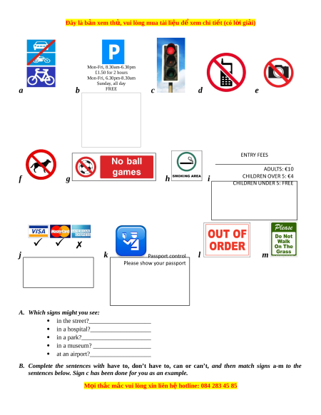 B. Complete the sentences with have to, don’t have to, can or can’t, and then match signs a-m to the