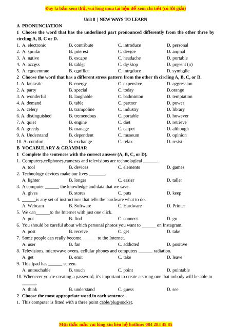 1 Choose the word that has the underlined part pronounced differently from the other three by circling A, B, C or D. 1. A. electronic B. contribute C. introduce D. personal 2. A. similar B. interest C. device D. animal 3. A. native B. escape C. headache D. portable 4. A. access B. tablet C. desktop D. present (n) 5. A. concentrate B. conflict C. introduce D. symbolic